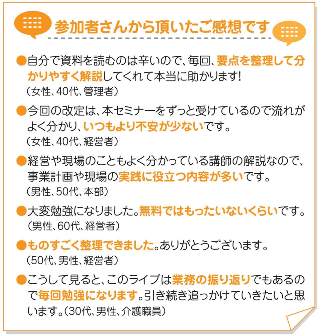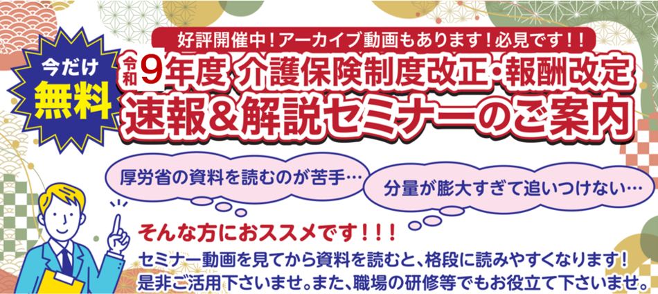 お申込み頂いた方には 「運営指導対策セミナー(約90分、通常は有料!)」を無料プレゼント中! 是非、令和9年度の改正内容とあわせて、事業所の皆さんでご覧下さい。