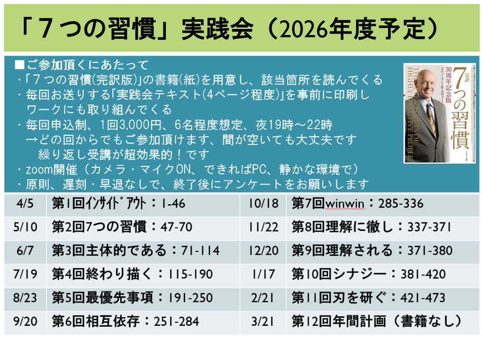 ■「7つの習慣実践会」とは、約1ヶ月に1章ずつ書籍を読み進め、